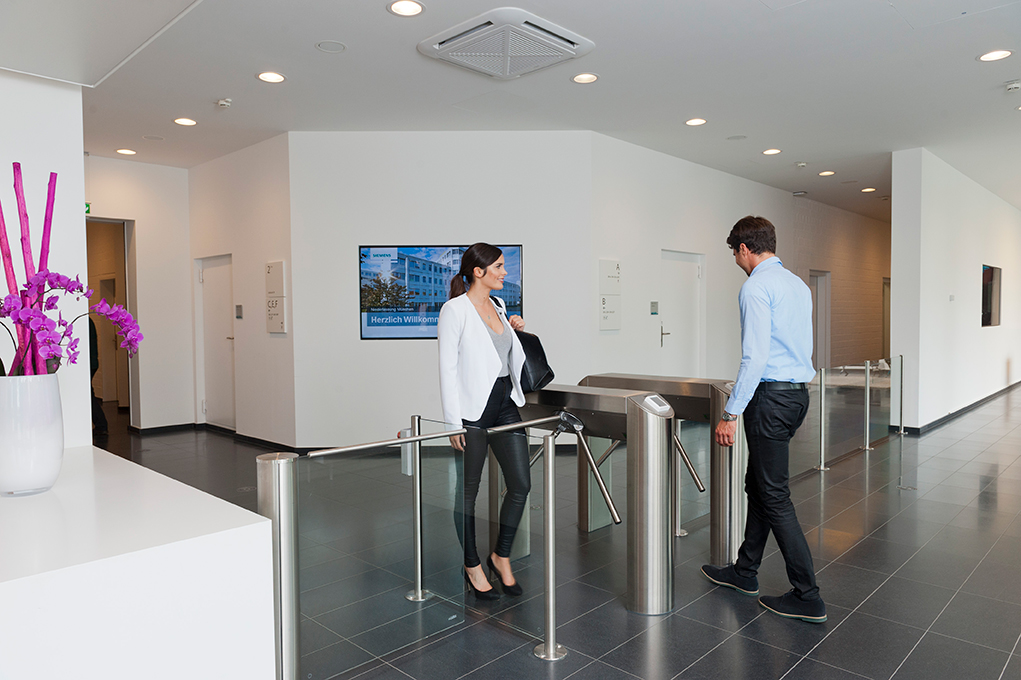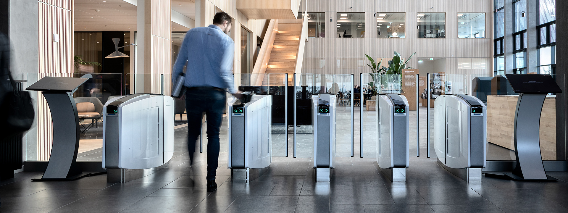 Our speed and swing gates are positioned in the middle of the pedestal to allow true bidirectional control and automatic free exit if desired. They are a good solution for intelligently controlling pedestrian traffic while maximizing throughput, and come in single lane or dual lane configurations for either entry or exit. The barriers are designed to close quickly and safely behind users after they have cleared the speed gate, deterring tailgaters.